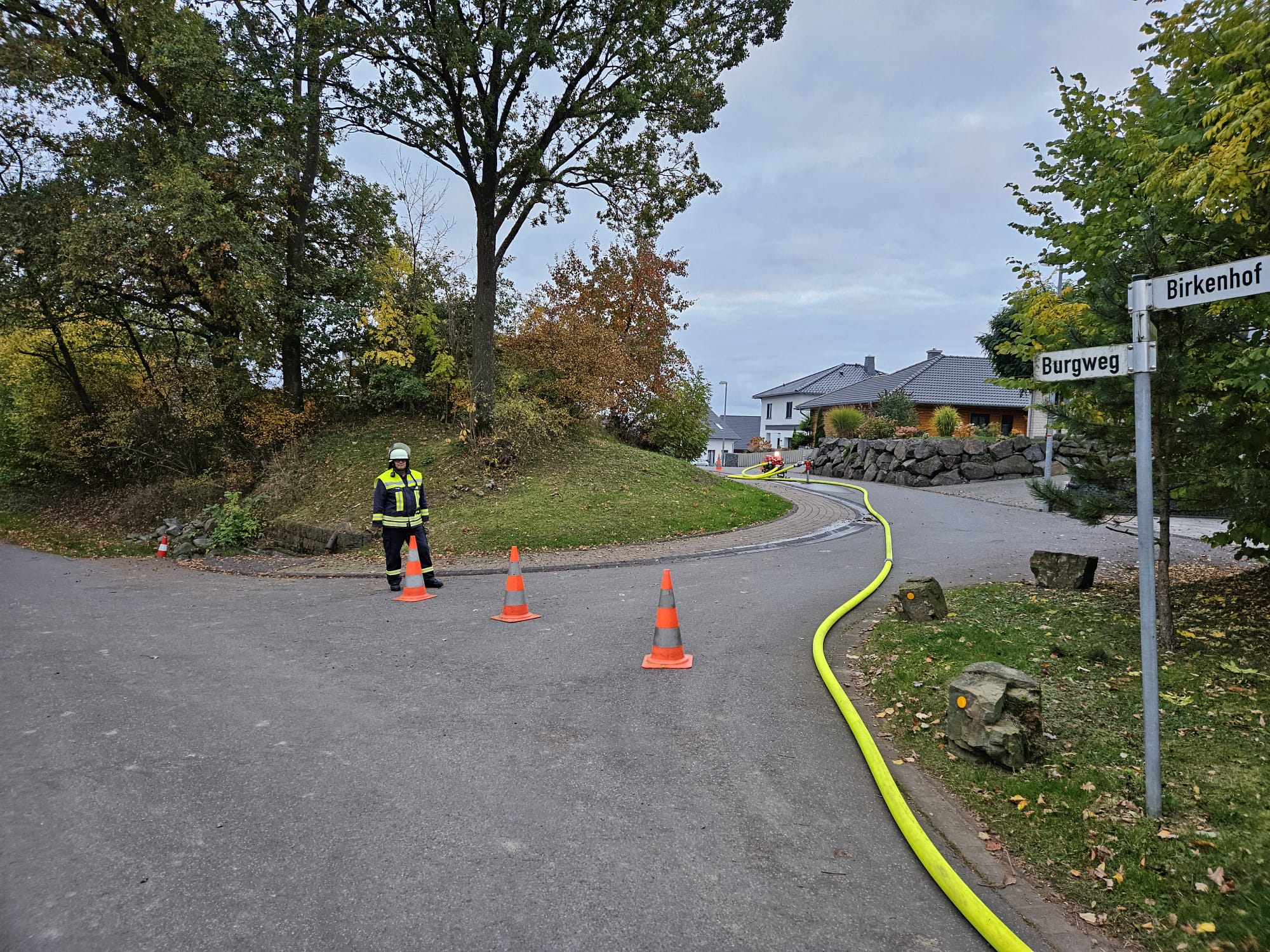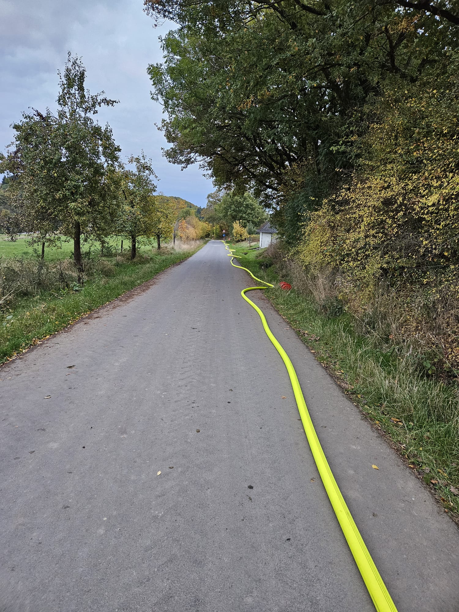 An der Kreuzung vor dem Waldhof wird ein Wasservorrat aufgebaut. Hier teilt sich auch die Wasserversorgung für die Löschfahrzeuge bzw. Angriffstrupps.