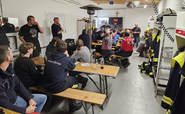 Nach dem Übungseinsatz und dem ordentlichen Rückbau aller Materialien wurde im Vereinsheim am Weilerer Sportplatz der Einsatz besprochen. Neben dem Lob für den personalstarken Einsatz wurde auch die Dauer des Aufbaues der Wasserversorgung bei dieser besonderen Ortslage kritisch hinterfragt.