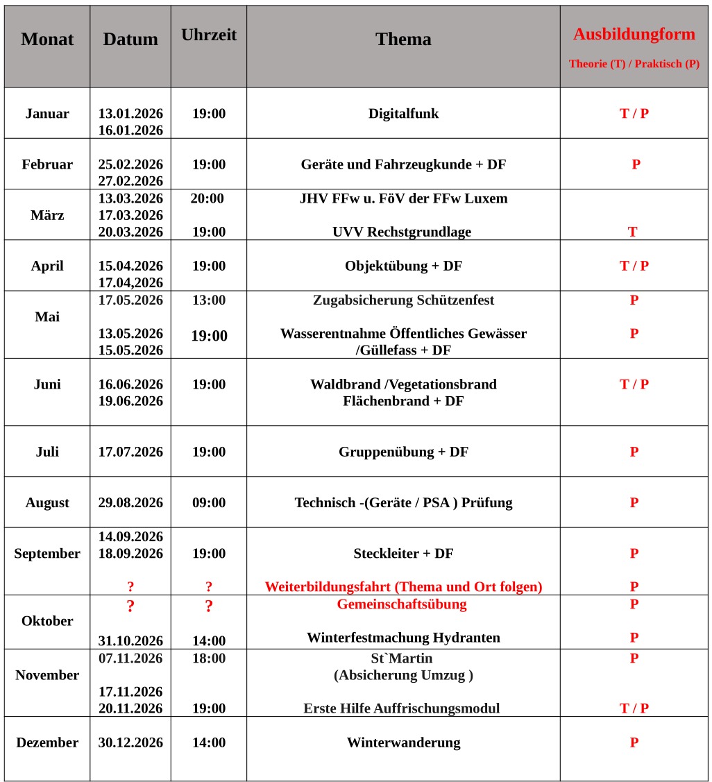 Übungs- und Terminplan 2026 *(Stand 1.12.2025)